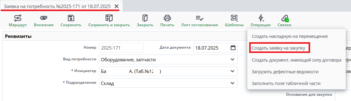 - 2 способ: Создание документа по операции из Заявки на потребность