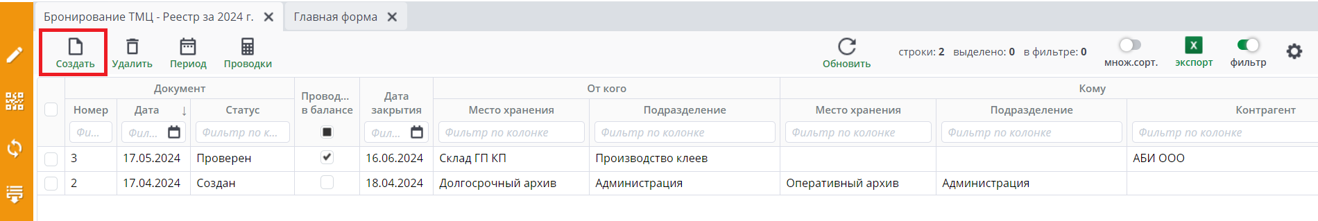 Для создания документа нажмите на кнопку “Создать” в реестре документов “Бронирование ТМЦ”.