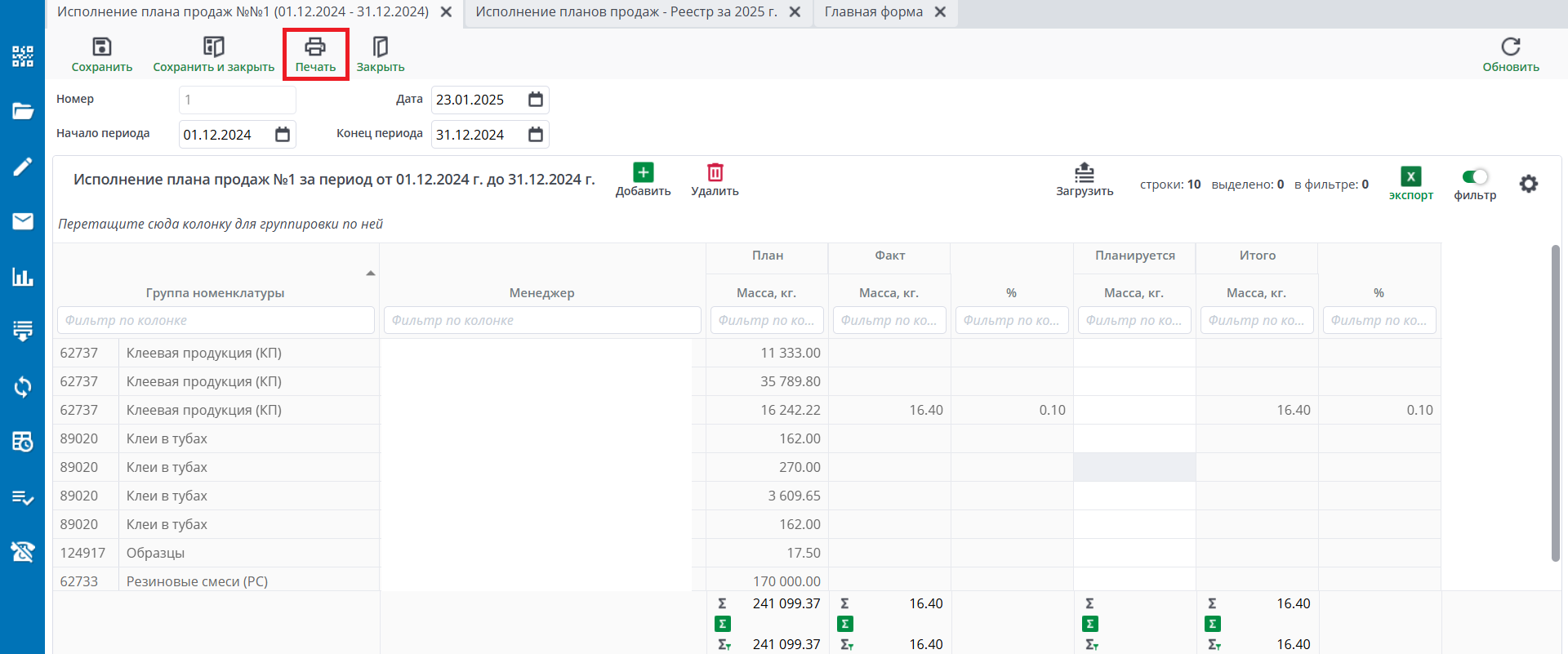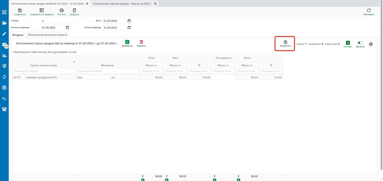 При нажатии на Загрузить заполнится табличная часть Исполнения плана продаж где: