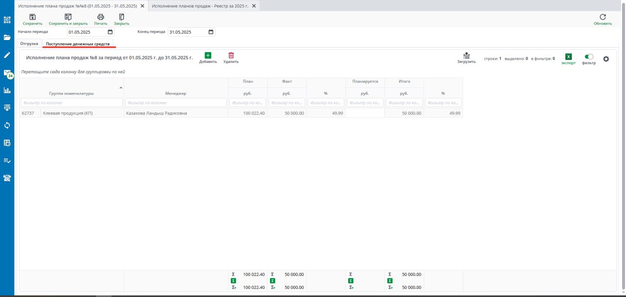 Документ состоит из двух вкладок: Отгрузка и Поступлени еденежных средств.