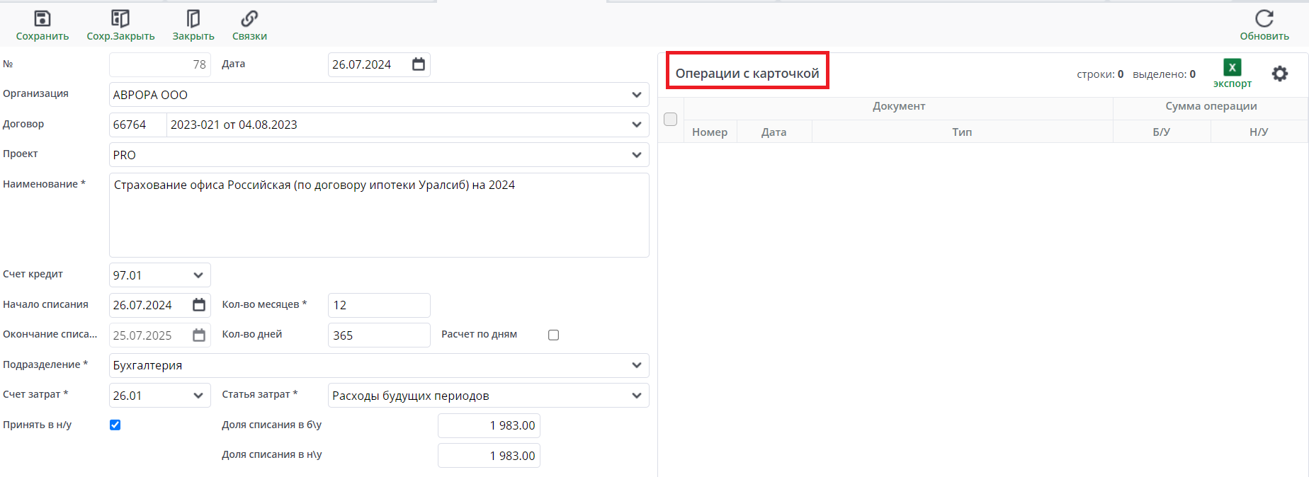 Карточка расходов будущих периодов