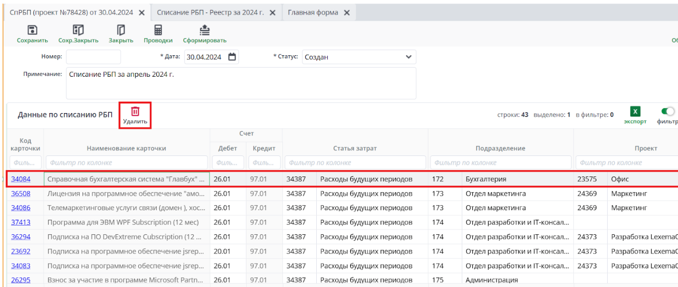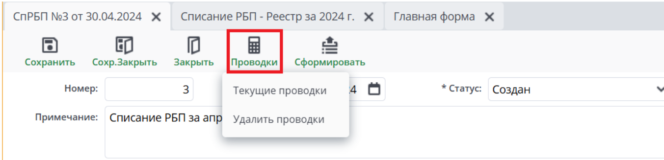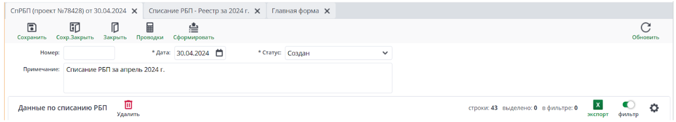 Откроется реестр Списаний РБП: