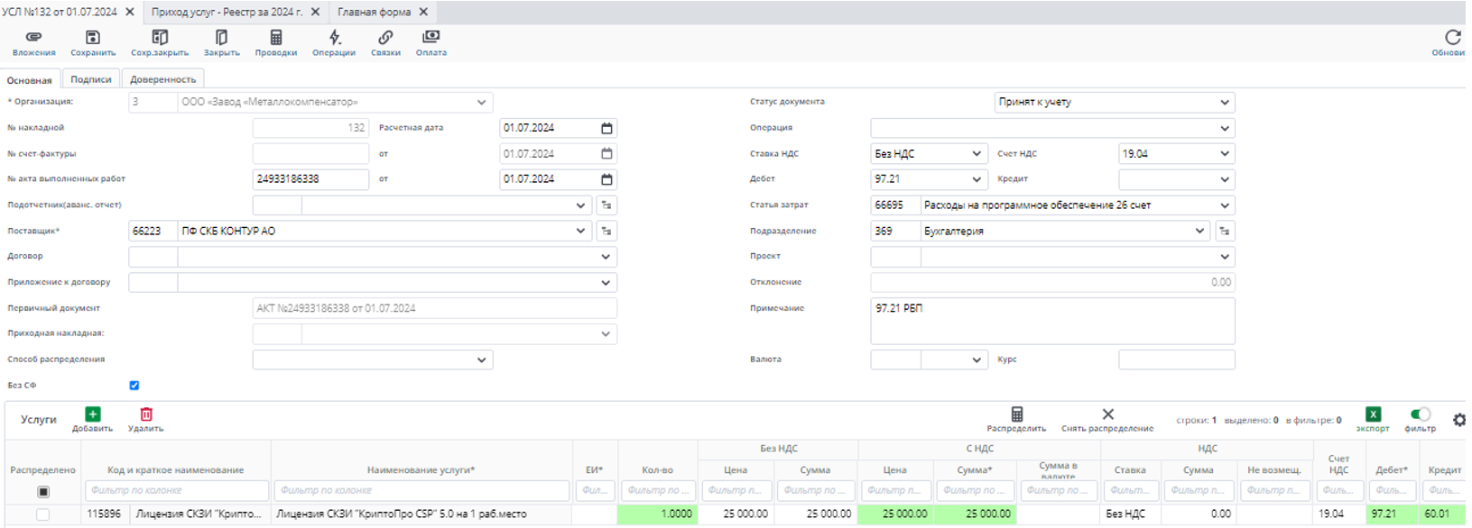 После заполнения полей карточку необходимо сохранить и вернуться в документ Приход услуг и так же сохранить его.