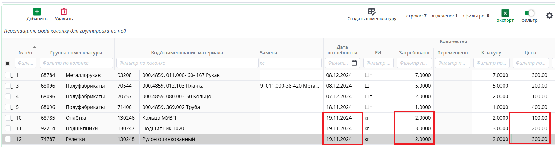 Укажите Количество Затребовано, а также Цену номенклатуры. Автоматически рассчитается Количество К закупу и Сумма.