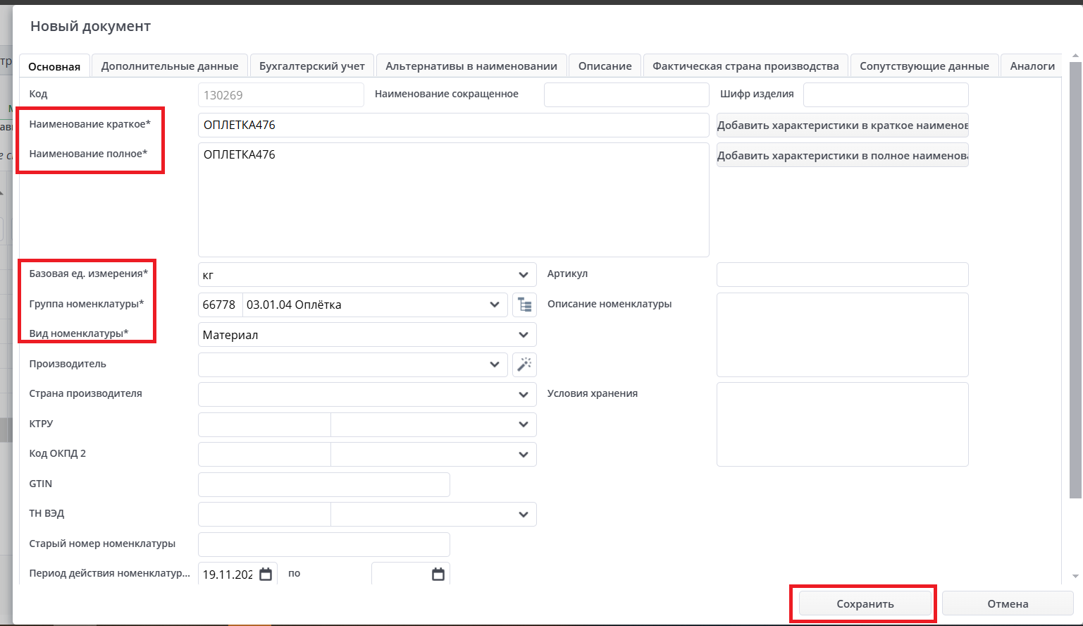 Откроется окно ввода новой номенклатуры, в котором требуется заполнить следующие поля: