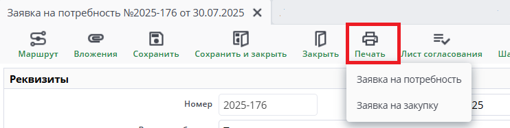 - По кнопке "Печать" можно сформировать документы: Заявка на потребность и Заявка на закупку.