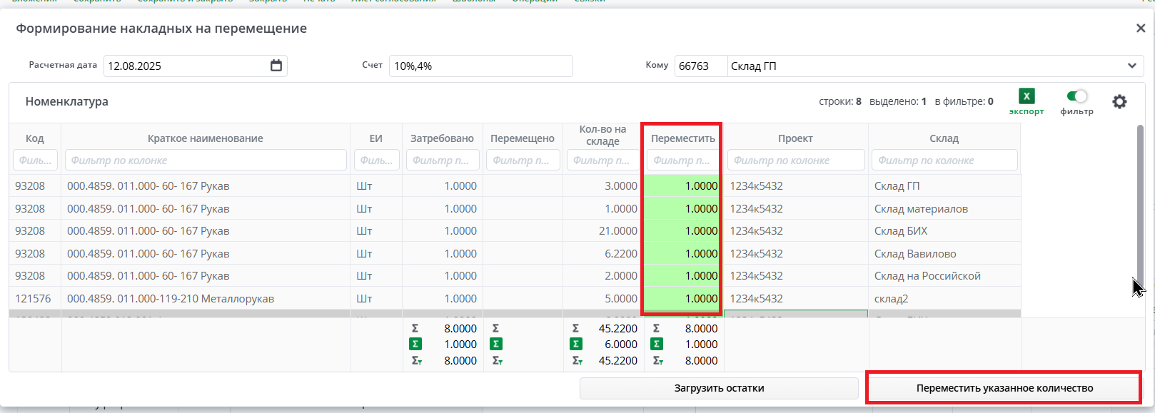 Создать накладную на перемещение - Создание накладной на перемещение из потребности происходит только из одного склада, чтобы создать из другого склада - нужно заново нажимать на операции и выбирать номенклатуру.