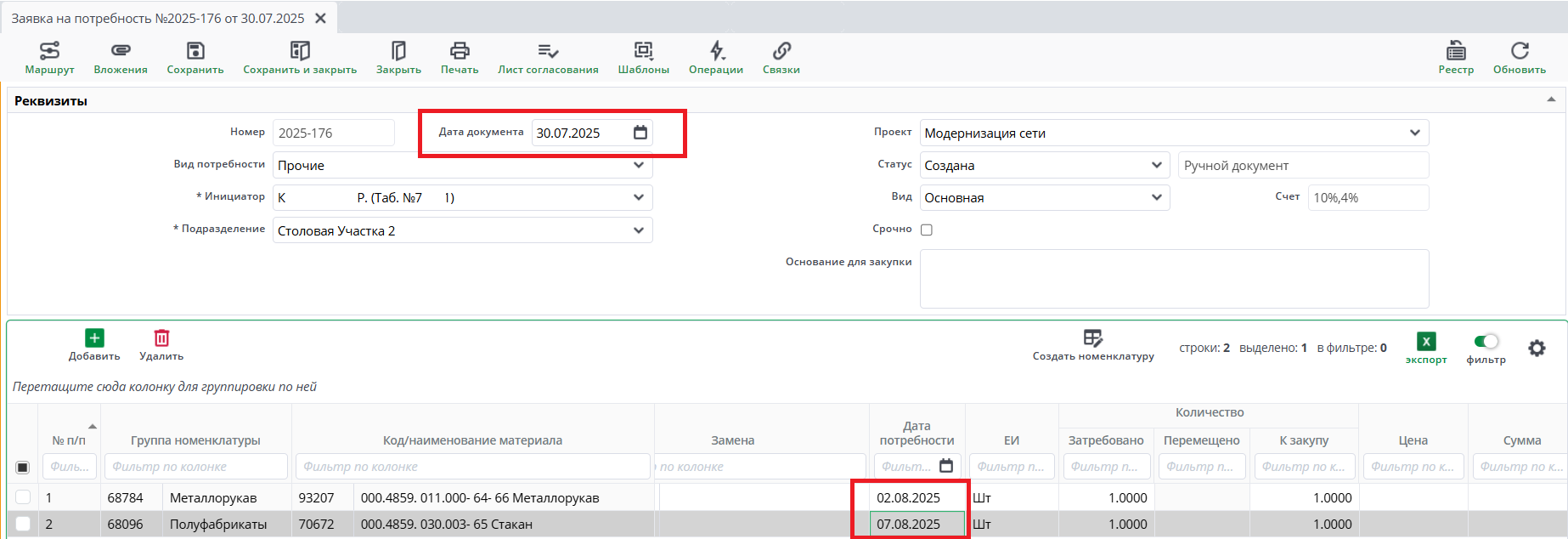 !!! note "Примечание" Обратите внимание, что Дата потребности не может быть раньше даты создания документа.
