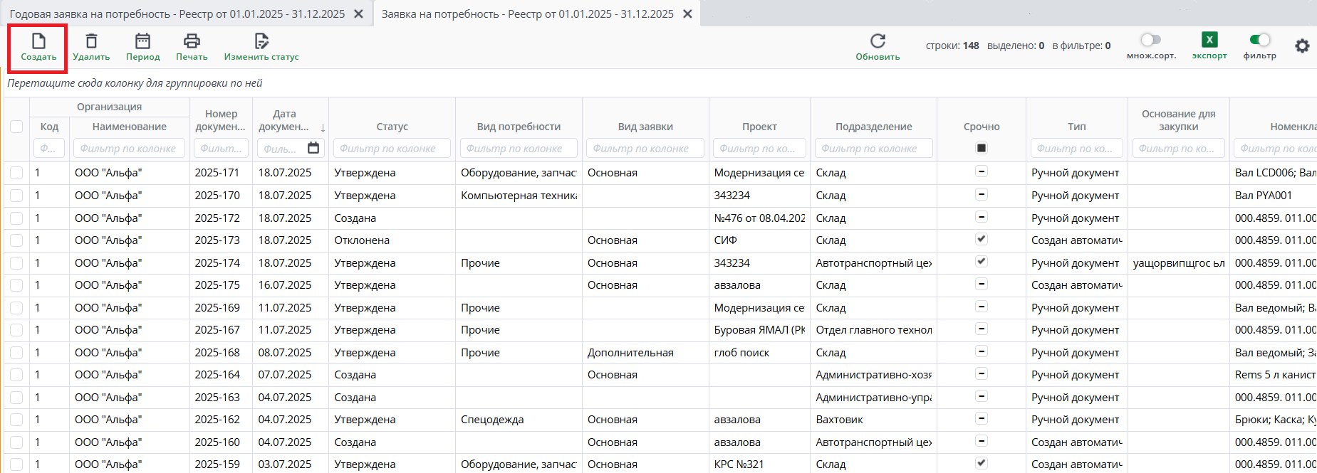 Для работы с документом откройте реестр Заявок на потребность. Для создания нового документа нажмите кнопку Создать.