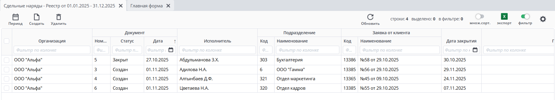 После нажатия на "Сдельные наряды" откроется реестр документов.