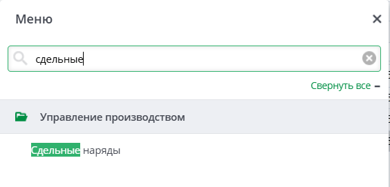 Документ можно найти через поиск в главном меню системы в модуле "Управление производством"
