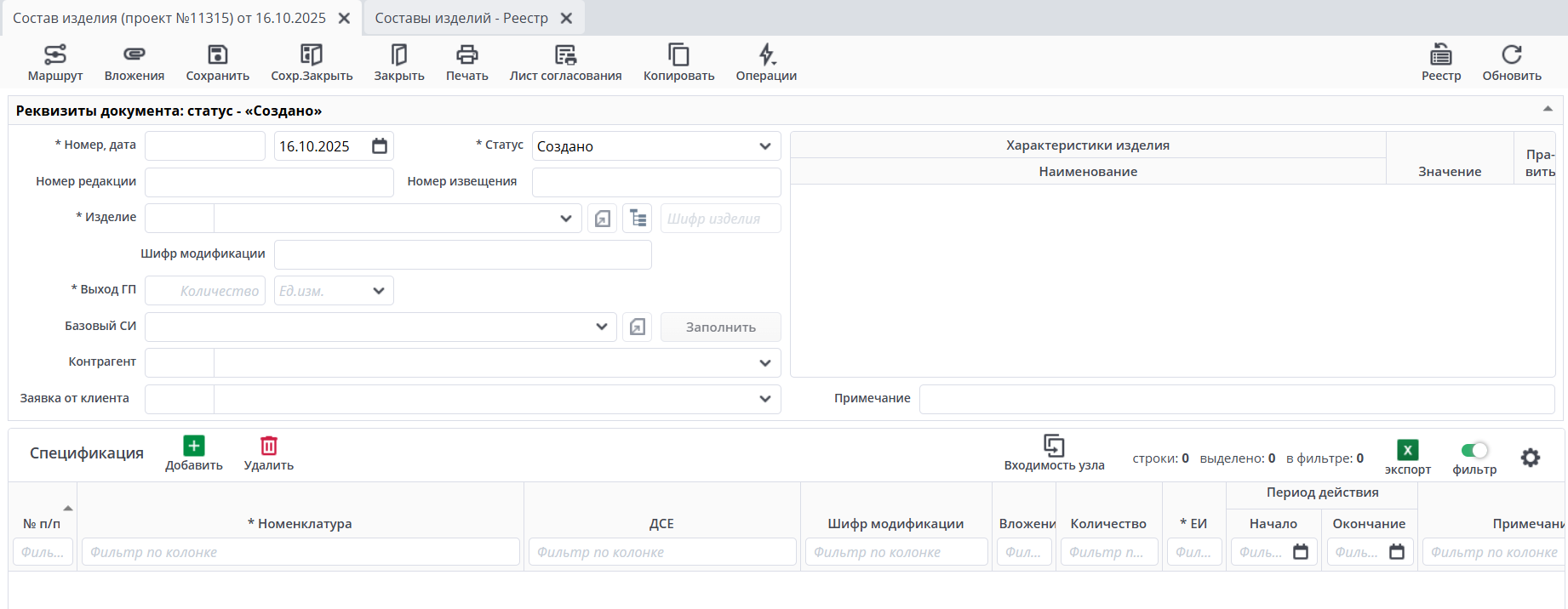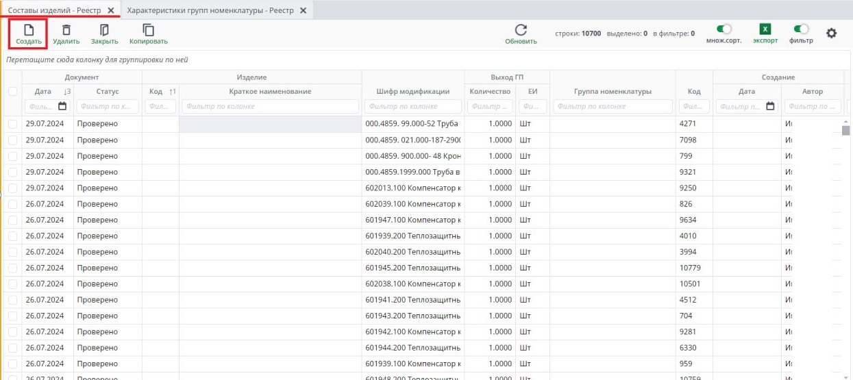 Нажмите на Составы изделий, откроется реестр. Чтобы открыть ранее созданный документ требуется нажать на него. Чтобы создать новый документ, требуется нажать на кнопку Создать