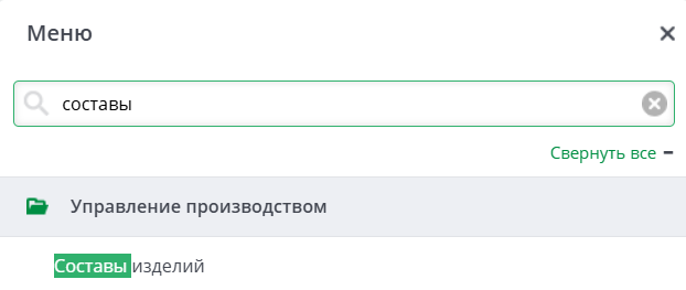 Для работы с документом Составы изделий необходимо перейти в Меню – найти группу Управление производством – открыть документ Составы изделий.