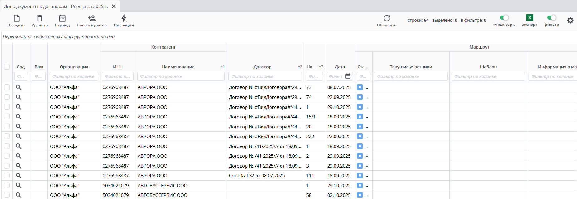 • Номер формируется автоматически при сохранении как порядковый номер дополнительного документа к договору.