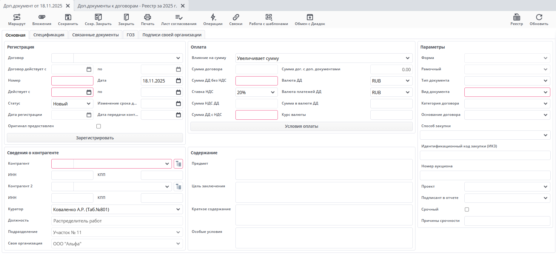 На вкладке “Основная” отражаются основные сведения о дополнительном документе. Вкладка разбита на окна: "Регистрация", "Сведения о контрагенте", "Оплата", "Содержание","Параметры".