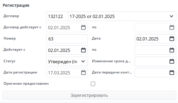 Кнопка Зарегистрировать регистрирует дополнительный документ в системе. После регистрации дополнительного соглашения, удаление запрещено по причине возможного изменения суммы либо даты регистрации.