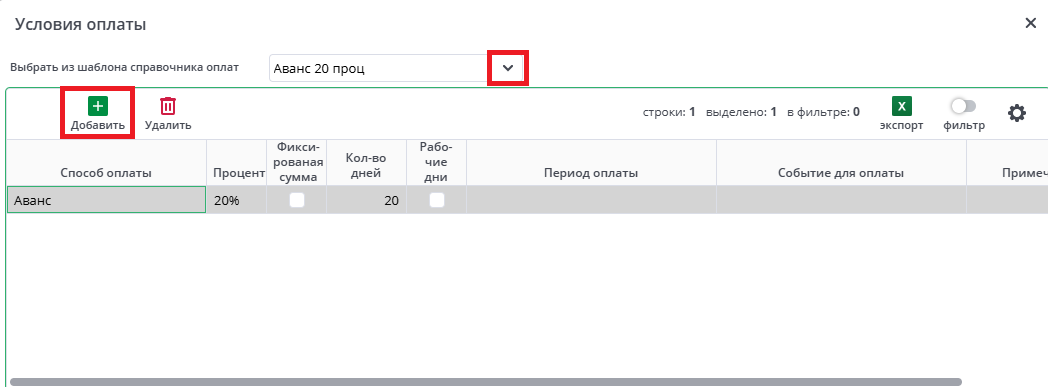 • Для заполнения условий оплаты, нужно перейти в форму по кнопке «Условия оплаты». По кнопке "Добавить" внести условия. По желанию можно выбрать из справочника шаблон.