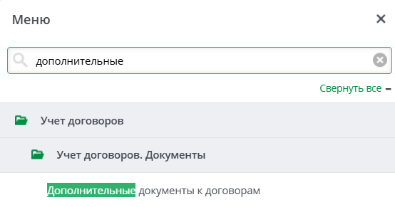 Или ввести в поисковое поле Меню Дополнительные документы к договорам.