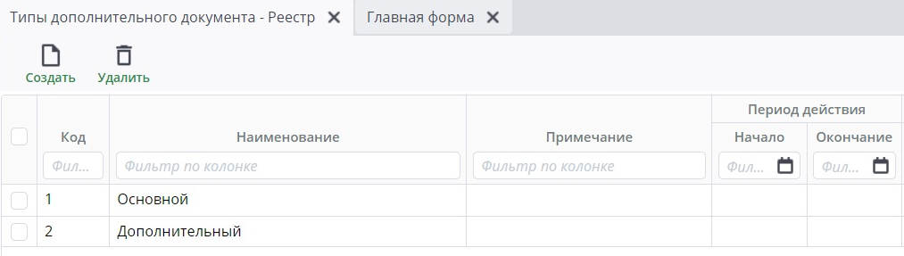 • Действует с" и "по" можно указать период времени, в течение которого данный тип дополнительного документа будет действовать в системе. По истечению заданного срока при создании документов данный тип не будет предложен. Если даты в полях не указаны, то тип документа считается бессрочным.