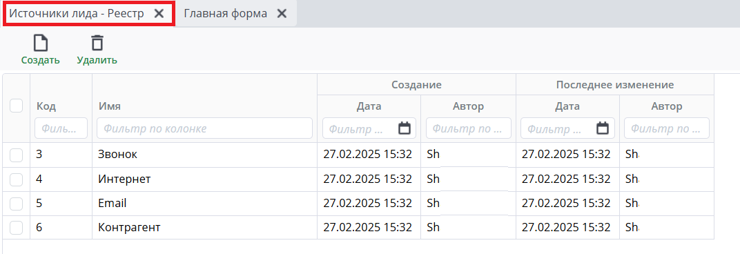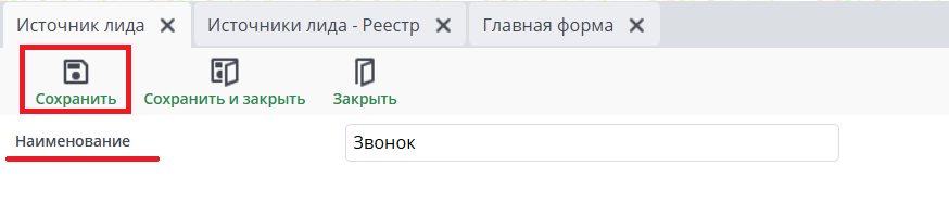 Для создания нового документа нажмите на соответствующую кнопку на панели управления. Введите Наименование Источника лида и сохраните документ