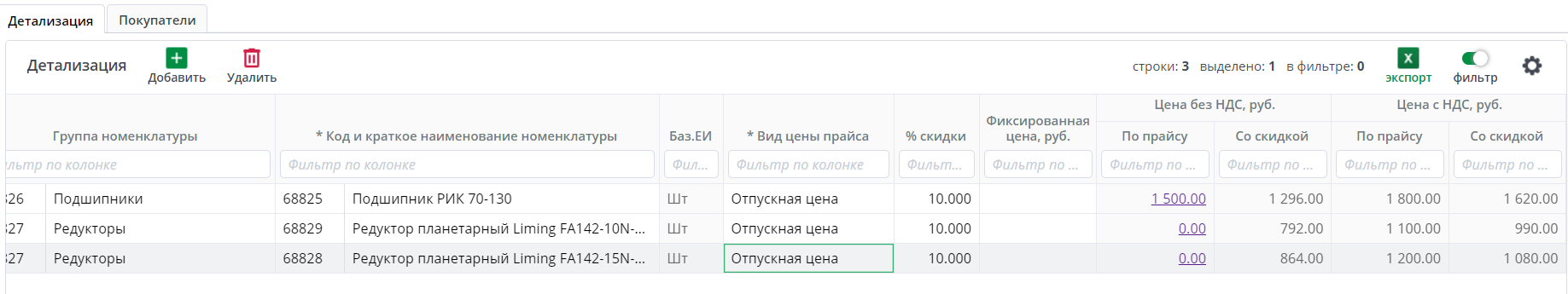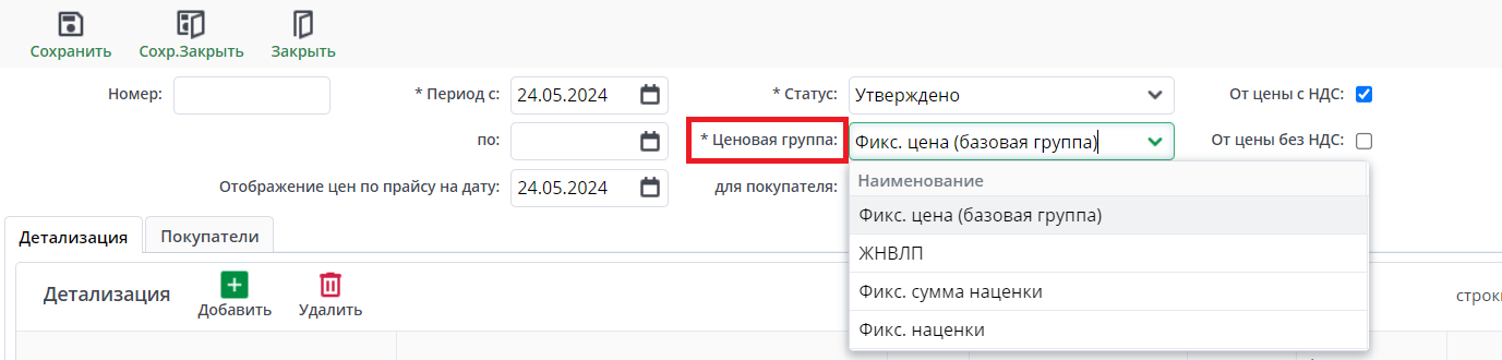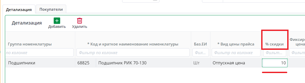 По кнопке ”+” в талице “Детализация” добавляется новая строка. Она нужно для добавления номенклатуры. Автоматически встало значение “Отпускная цена” в поле “Вид цены прайса”.