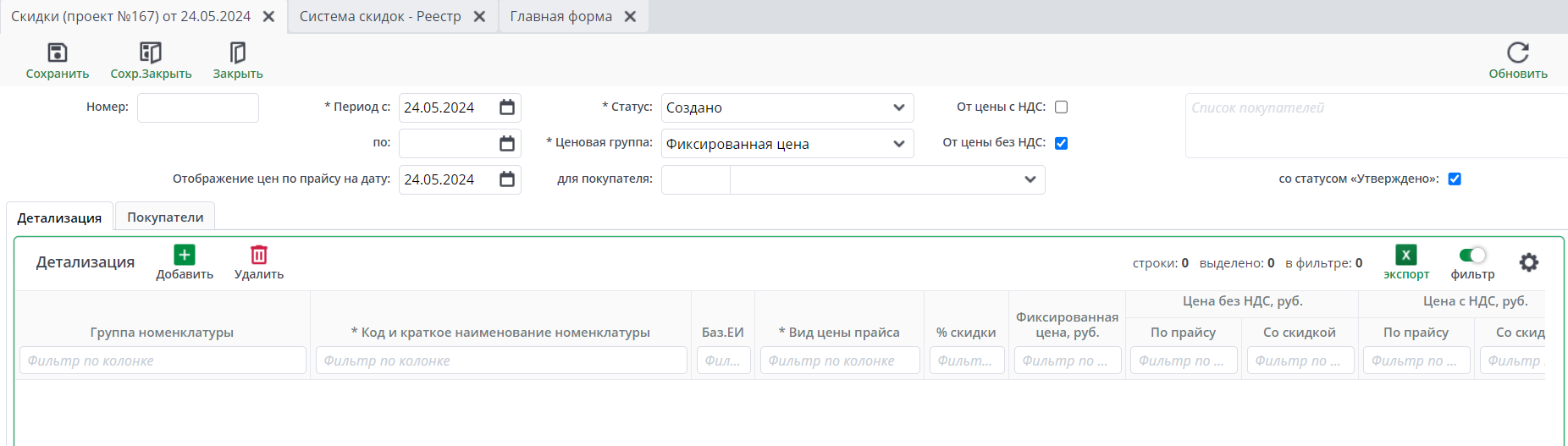 Откроется реестр системы скидок: