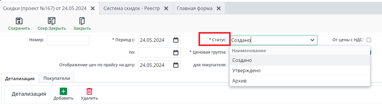 Для того, чтобы была возможность применять систему скидок, необходимо присвоить документу статус “Утверждено”, а затем нажать на “Сохранить” или “Сох.Закрыть”.