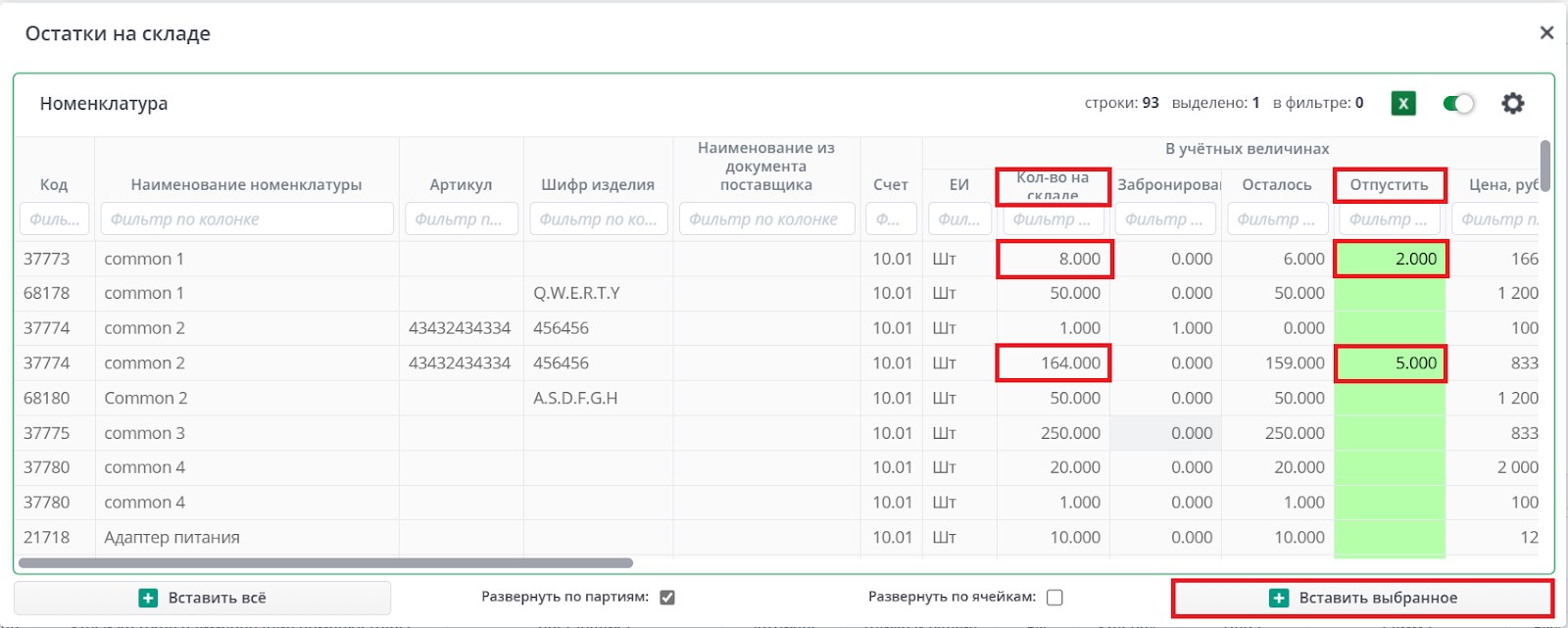 Далее заполняется колонка "Отпустить". При нажатии кнопки "Вставить выбранное" информация о номенклатуре и количестве вставится в таблицу документа. Нажатие на кнопку "Вставить все" повлечет вставку всех остатков по счету в документ. Вставка осуществляется в зависимости от вида комплектации.