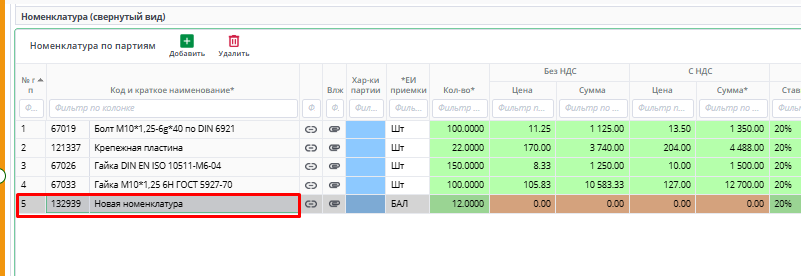• ЕИ, Артикул заполняется автоматически после выбора номенклатуры