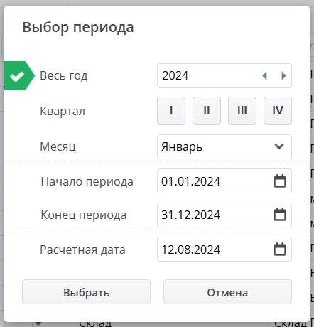 Чтобы изменить Период, необходимо нажать на соответствующую кнопку в шапке документа, и выбрать, например, весь год