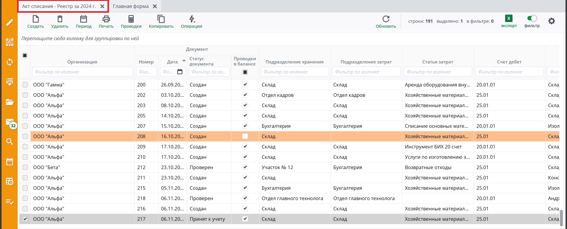 После выбора расчетного периода по кнопке «Выбрать» откроется реестр документов.