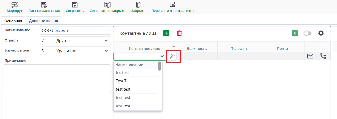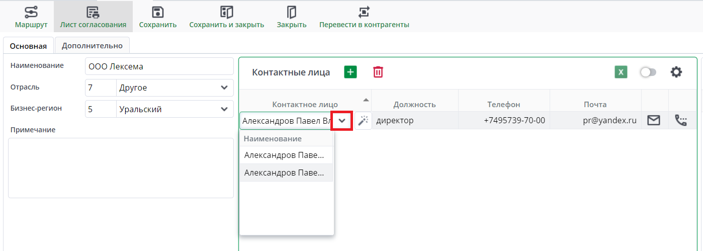 Для выбора Контактного лица, уже заведенного в системе, следует воспользоваться выпадающим списком. Данные поля “Телефон” и “Почта” проставляются автоматически после выбора Контактного лица.