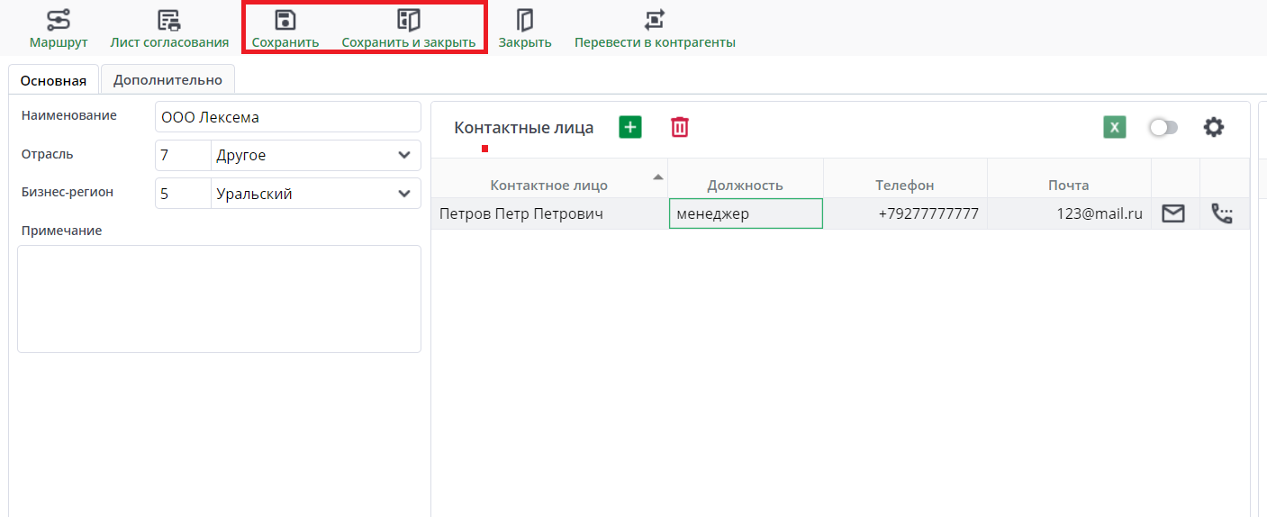 Откроется окно “Новое контактное лицо”, в которое вносятся данные нового контакта. После заполнения полей нажмите на кнопку “Сохранить”.