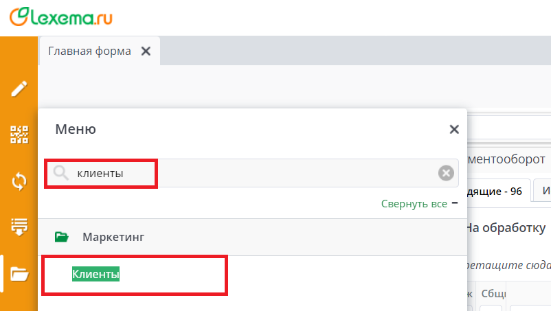 Для открытия реестра документов необходимо зайти в Меню – Найти группу Маркетинг – Открыть документ Клиенты.