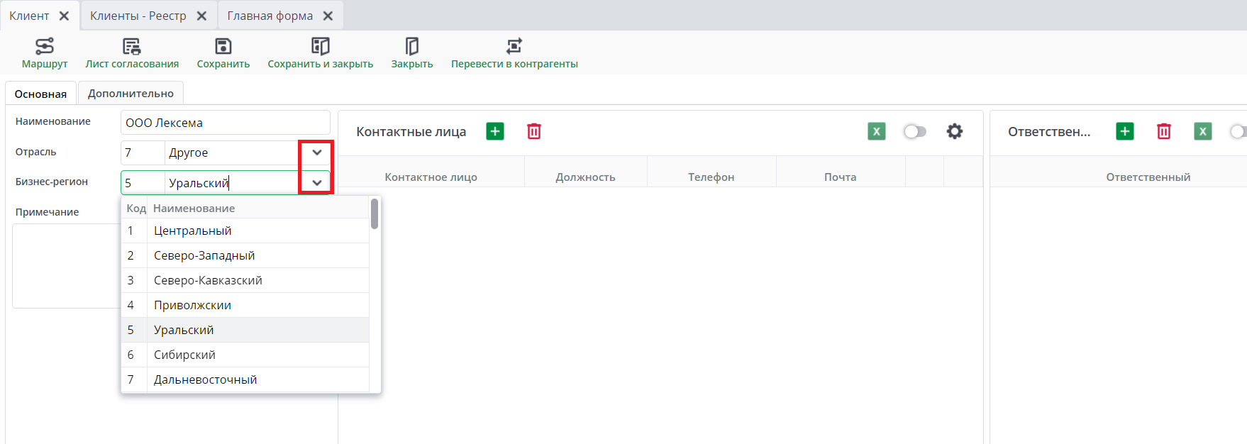 !!! note "Примечание" данные полей Отрасль и Бизнес-регион хранятся в одноименных справочниках.