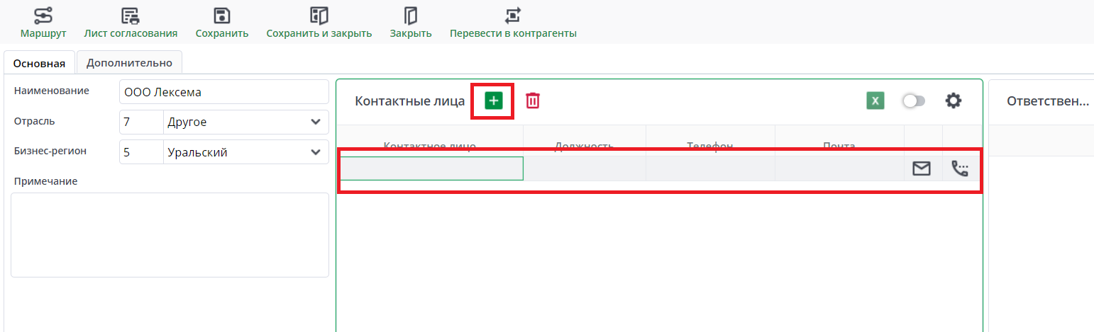 Чтобы внести данные в таблицу “Контактные лица” необходимо нажать на “+”. Появится новая строка.