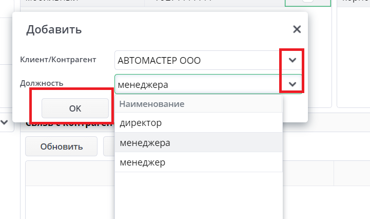 Откроется окно для выбора контрагента и должности, при условии, что данный контрагент заведен в системе. Контакт можно привязать к нескольким контрагентам.