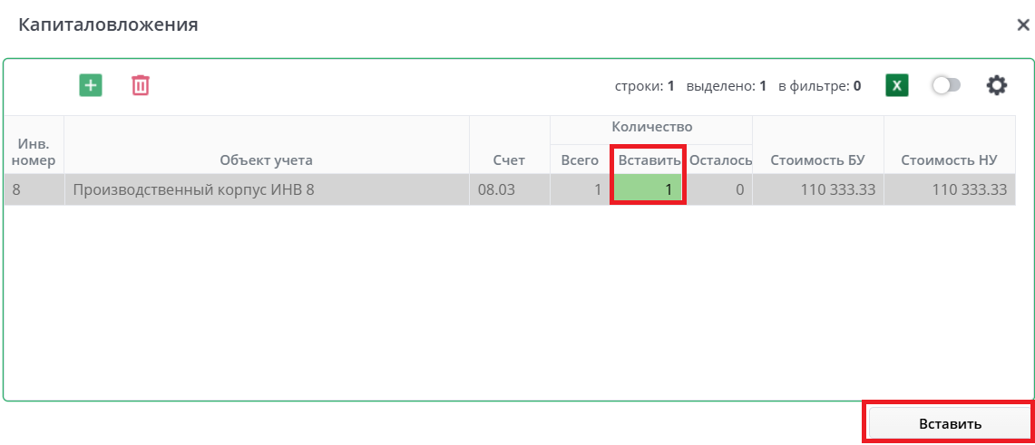 Данная кнопка открывает окно с капиталовложениями по кредитовому счету Операции. Нужно указать кол-во в колонку "Вставить" и нажать на кнопку "Вставить".