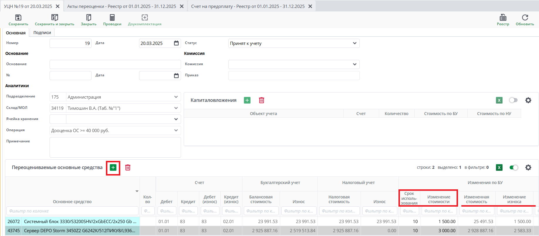 , затем из выпадающего списка выбираем переоцениваемые основные средства. В колонках «Изменение по БУ» и «Изменение по НУ» указываем срок использования и изменение стоимости. Измененная стоимость, изменение износа и измененный износ заполнтся автоматически.