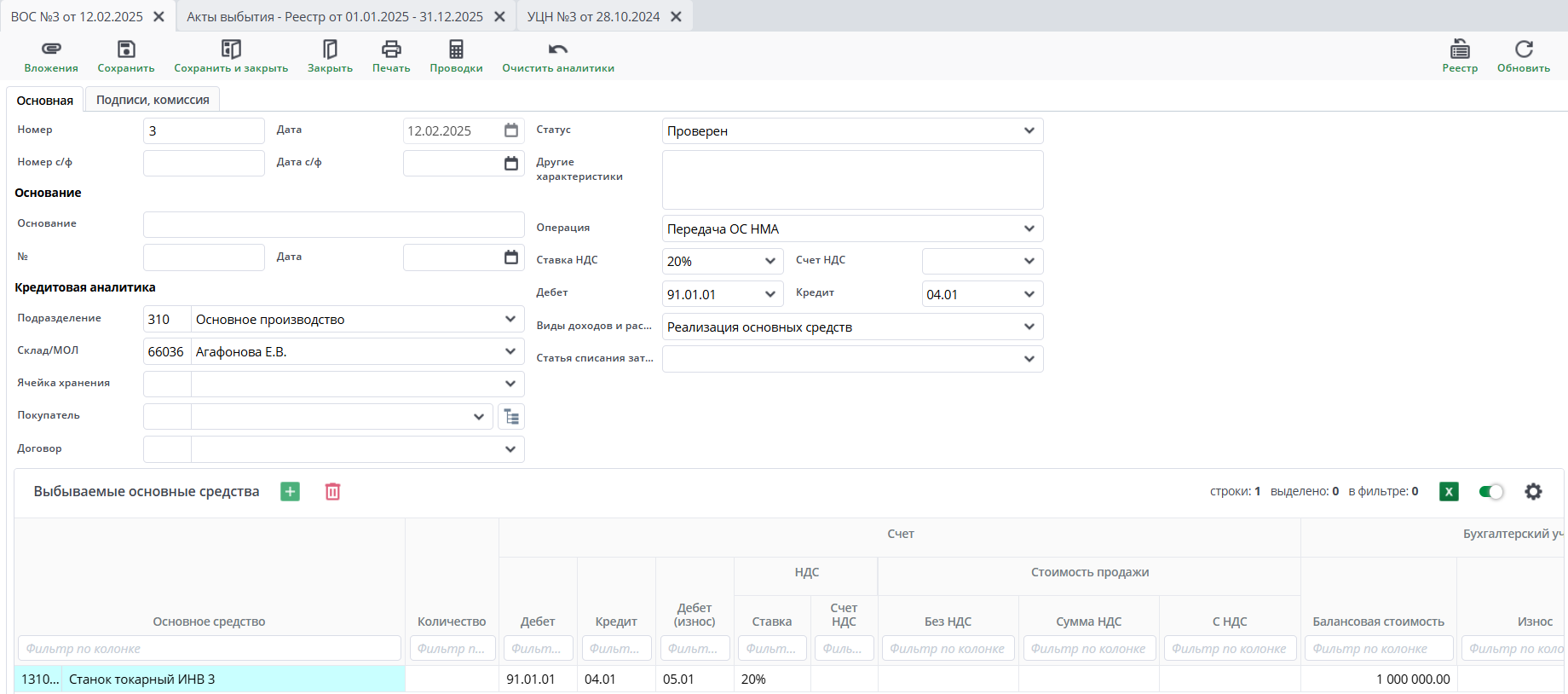 Если основное средство выбывает не по ветхости и износу, то оформляется документ «Акт выбытия», но с указанием покупателя в шапке документа. В данном случае документ предназначен для оформления продажи основных средств.