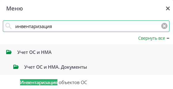 Документ «Инвентаризация объектов ОС» предназначен для оформления результатов инвентаризации основных средств организации. Документ находится в главном меню системы.