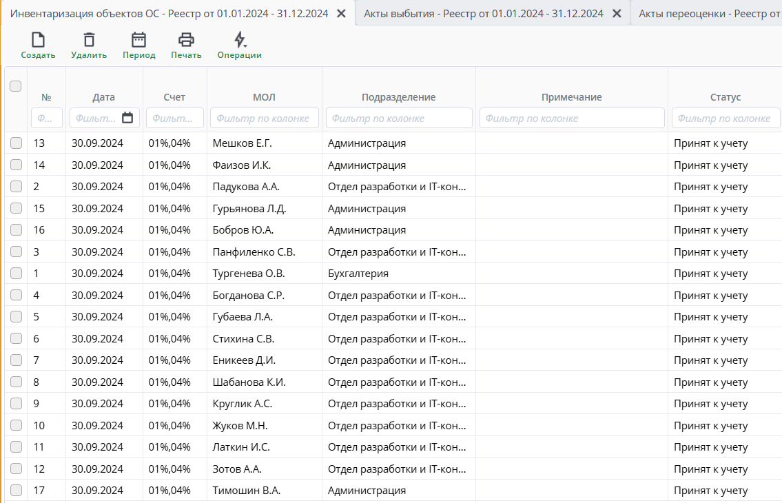 Нажмите на «Инвентаризация объектов ОС». Откроется реестр документов.