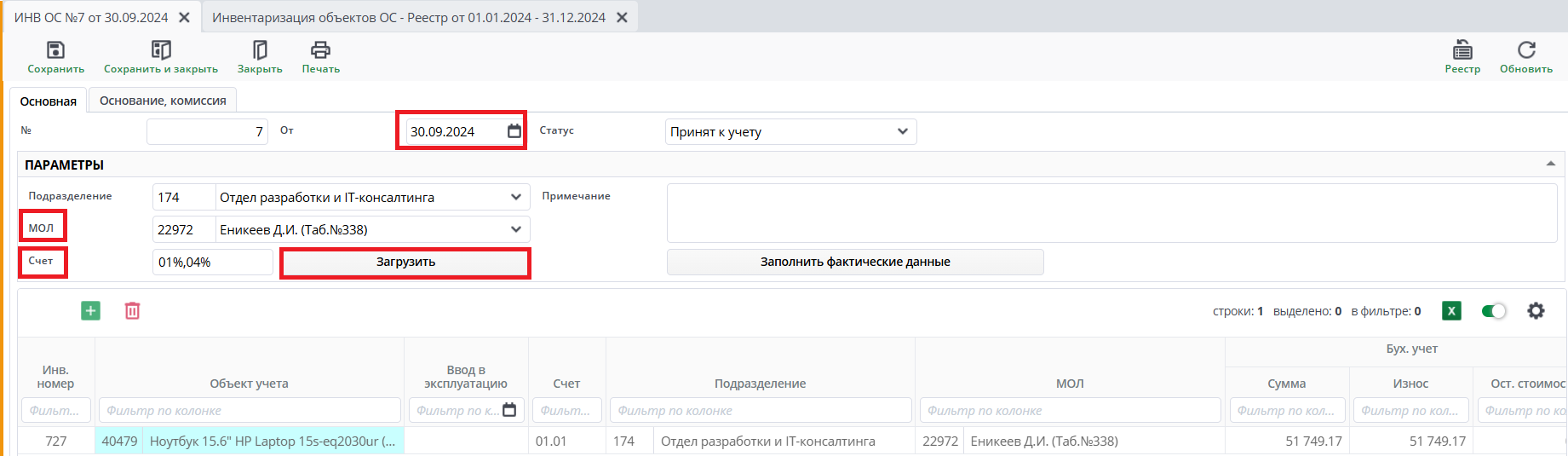 В шапке документа дата заполняется автоматически сегодняшним числом. Затем необходимо указать МОЛ и Счет, который будет инвентаризироваться. Данные учета заполняются по данным информационной базы при помощи кнопки «Загрузить».