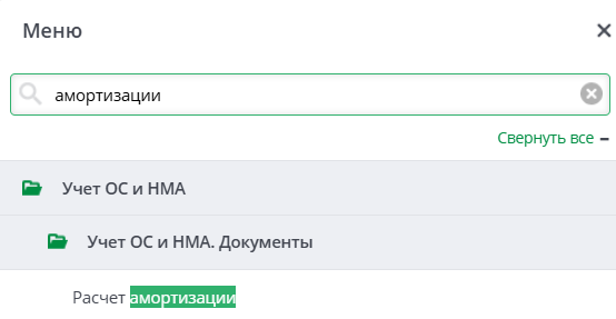 Документ «Расчет амортизации» предназначен для запуска расчета амортизации тех объектов основных средств/НМА, для которых стоимость погашается посредством начисления амортизации. Найти этот документ можно в главном меню системы в модуле "Учет ОС и НМА"