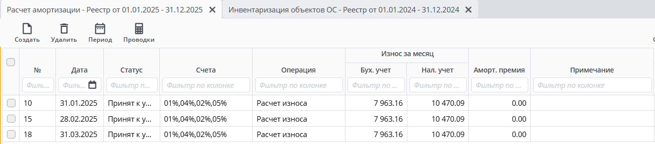 По кнопке «Сформировать» загружается список основных средств с рассчитанными суммами в табличную часть документа.