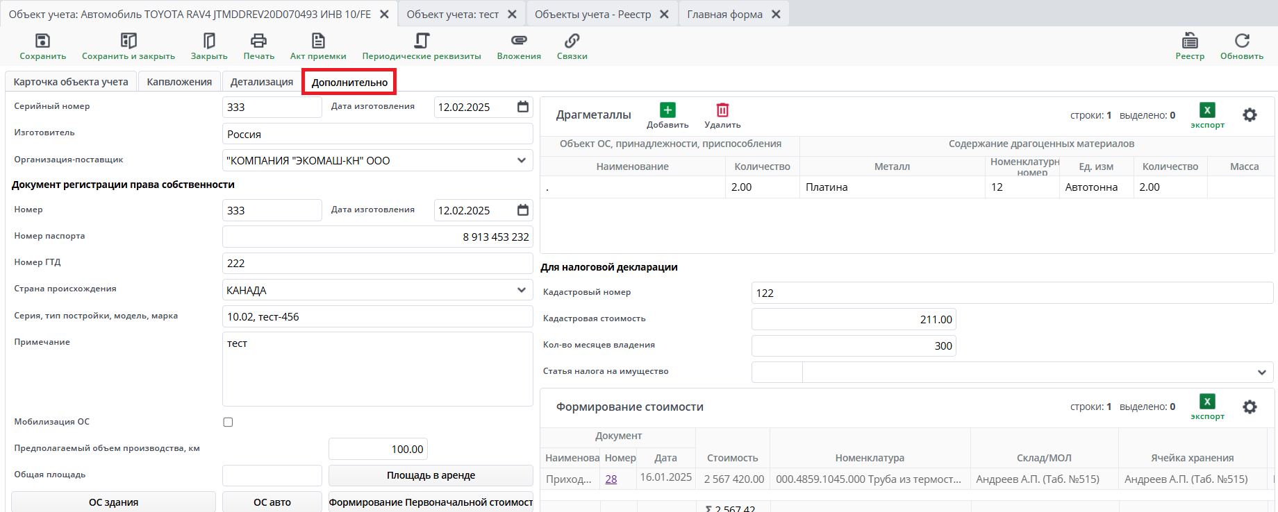 Данные в карточке распределены по вкладкам: Карточка объекта учета, Капвложения, Детализация и Дополнительно.