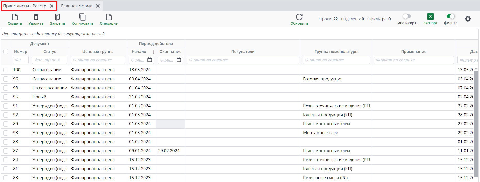 Чтобы создать Прайс-лист, нажмите на соответствующую кнопку в реестре документов: