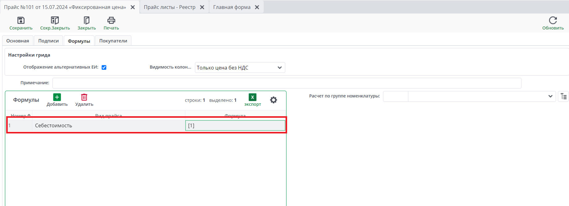 В первой строке всегда выбирать Себестоимость т.к. от нее считается Пороговая и Отпускная цены. [1] - заполнится при выборе себестоимости это присвоен номер строки. Значение участвует в формулах.