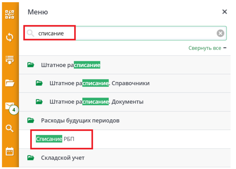 Для открытия реестра документов необходимо зайти в Меню* Найти группу Расходы будущих периодов нажать на Расходы будущих периодов (РБП).