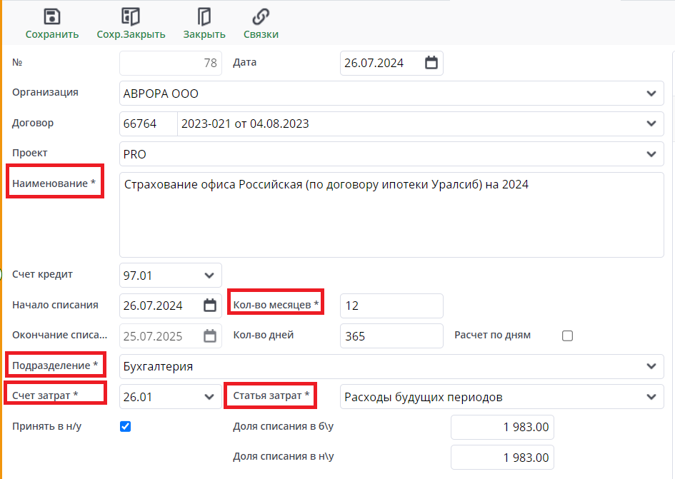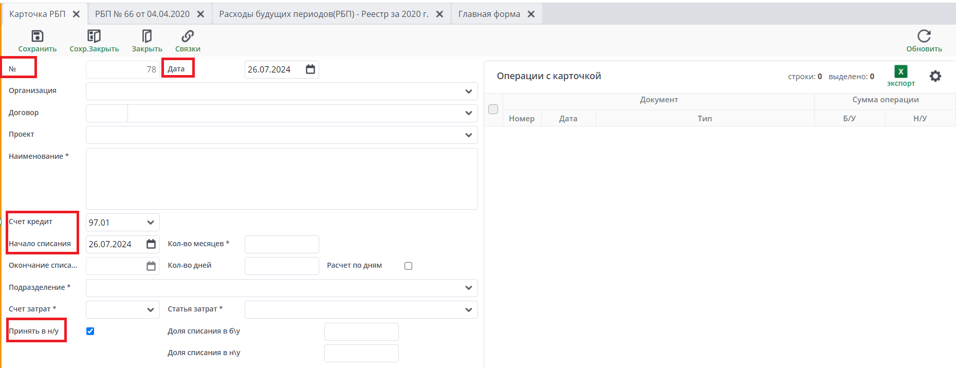 Карточка расходов будущих периодов